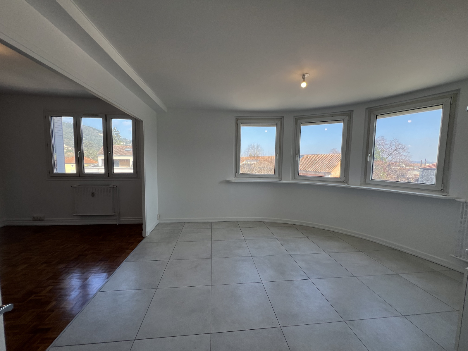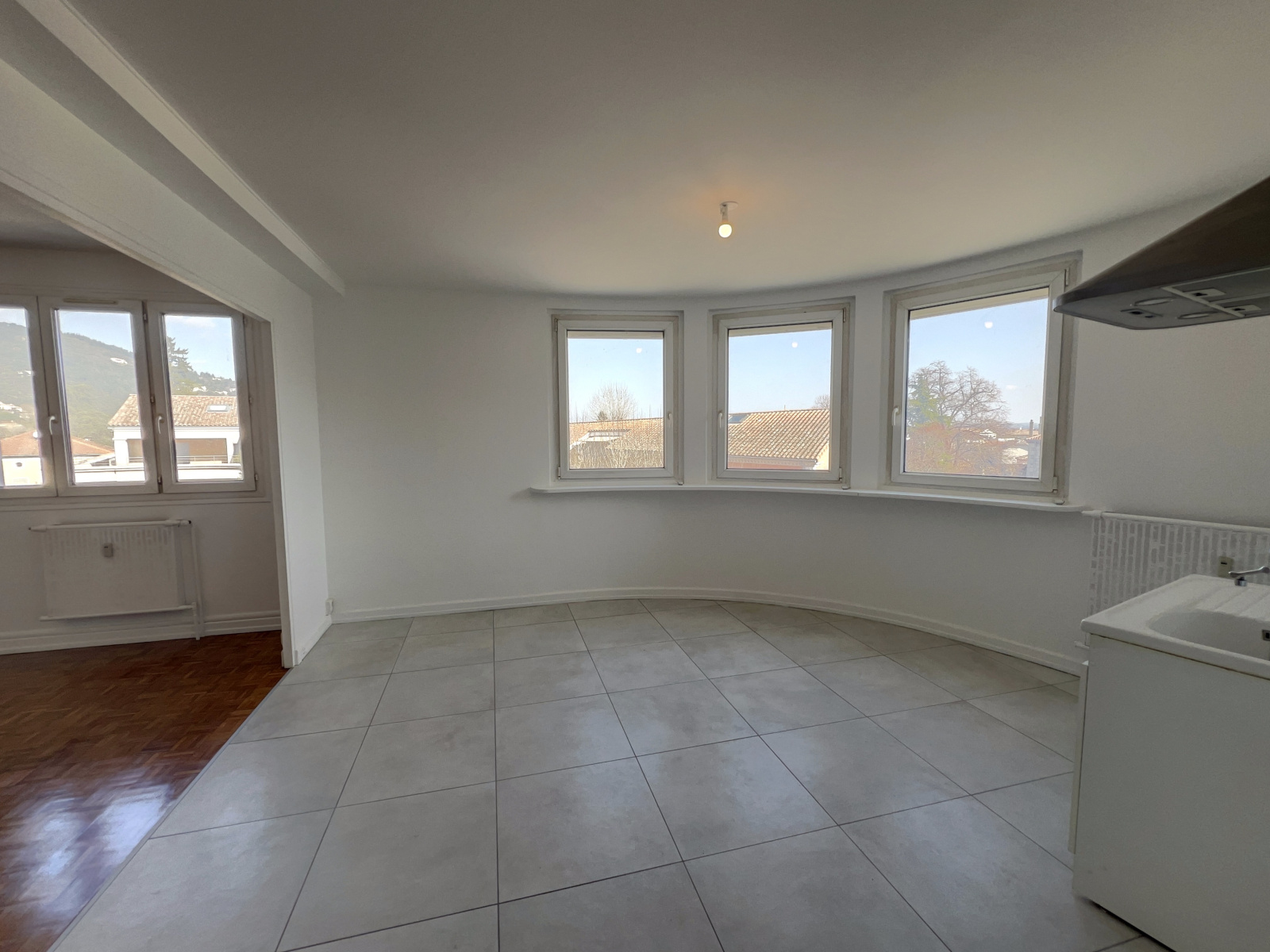 Grande pièce de vie avec cuisine ouverte de 29m² lumineuse grâce à de larges ouvertures.